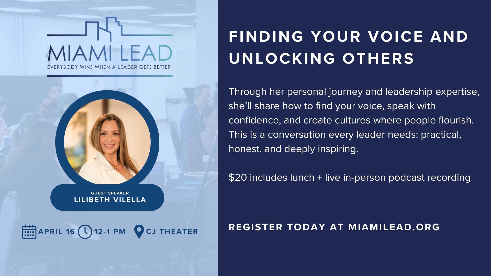 Join us as we welcome Lilibeth Vilella! She'll share insight to help in "Finding Your Voice and Unlocking Others". Through her personal journey and leadership expertise, she’ll share how to find your voice, speak with confidence, and create cultures where people flourish. This is a conversation every leader needs: practical, honest, and deeply inspiring.